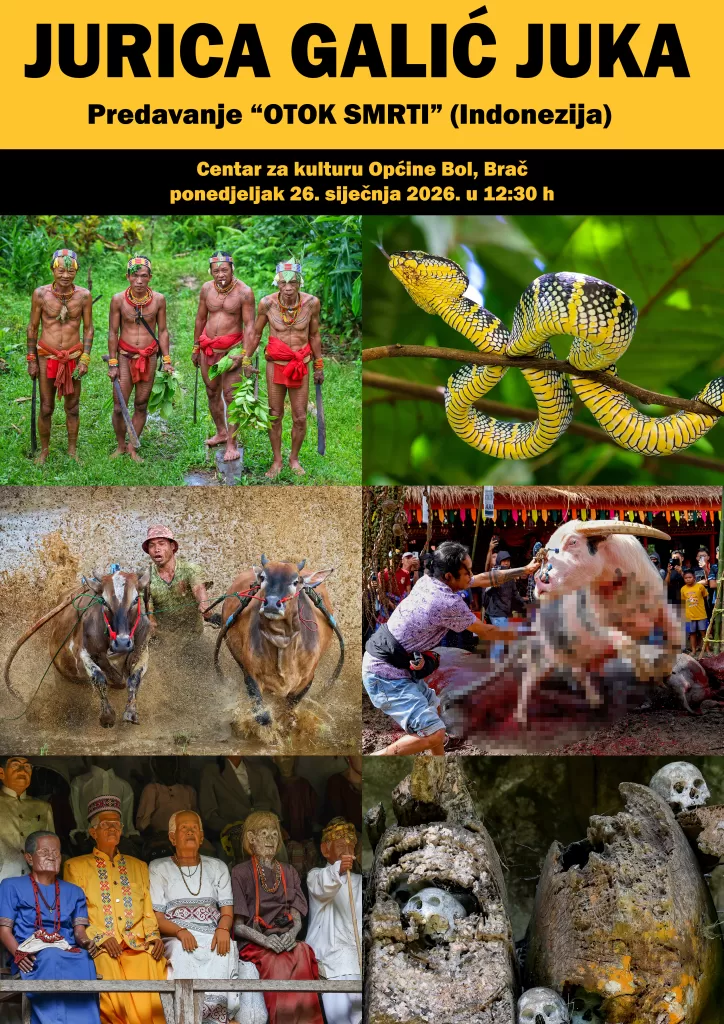 U Centru za kulturu Općine Bol danas je održano putopisno predavanje „Otok smrti (Indonezija)” poznatog hrvatskog putopisca, reportažnog fotografa i svjetskog putnika Jurice Galića Juke. Predavanju je prisustvovalo oko 60 učenika Srednje škole Bol, koji su s velikim zanimanjem pratili autorovo izlaganje.